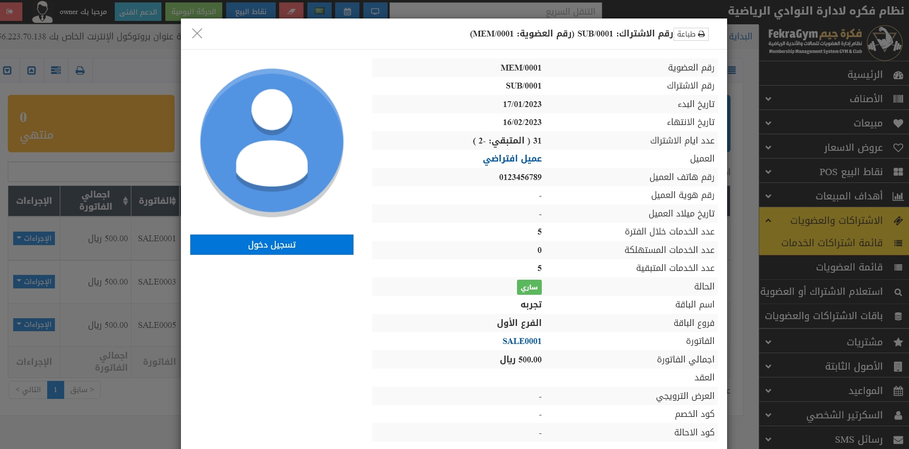 نظام إدارة متكامل لجميع المشتركين في الجيم أو مراكز اللياقة والنوادي الصحية والرياضية من أول تسجيل الاشتراكات الجديدة وإدخال بيانات المشتركين لأول مرة والتقاط صور شخصية لهم وحفظها في ملف خاص بكل عميل يضم تاريخ انضمامه ونوع العضوية ومدة أو باقة الاشتراك لمتابعة اشتراكه بشكل دوري وحصصه التدريبية بحيث يتم إلغاء أو تجديد الاشتراك تلقائيًا.