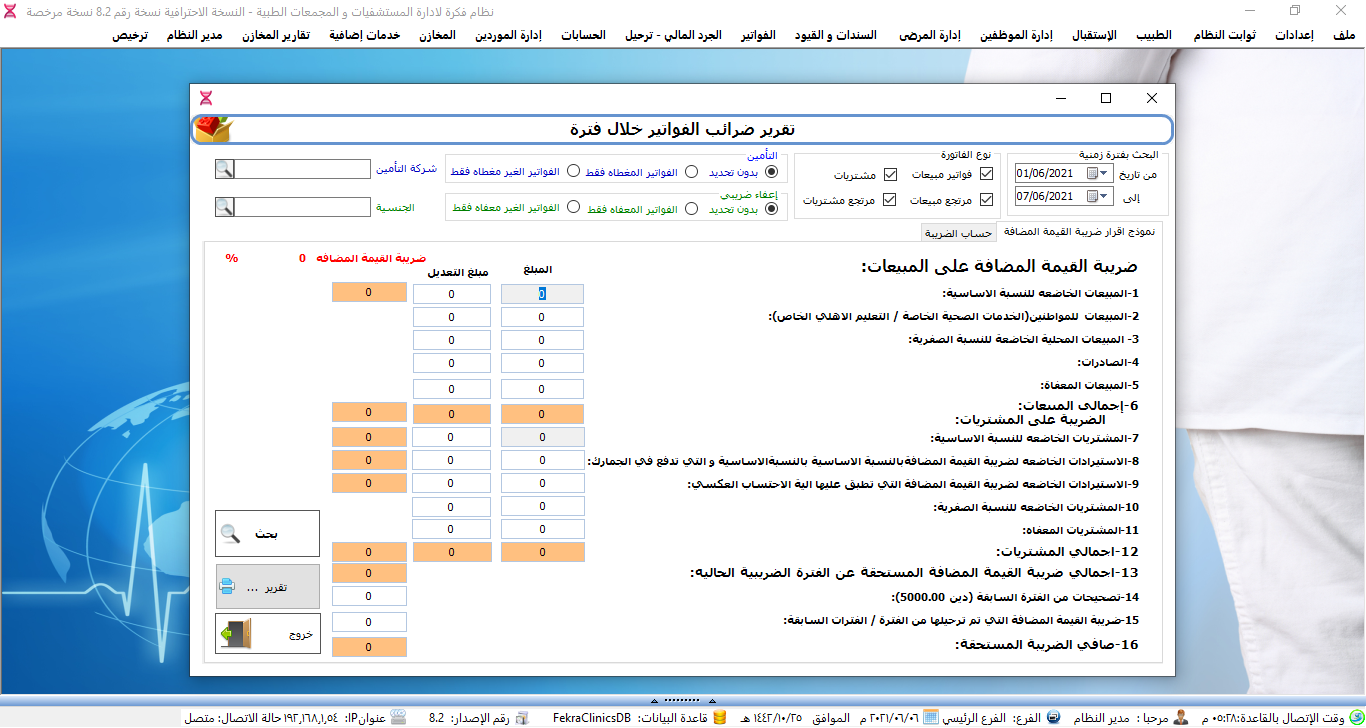 يوفر البرنامج الدعم الكامل لمختلف أشكال الضرائب المفروضة على تقديم الخدمات الطبية بما فيها ضريبة القيمة المضافة والقدرة على تفعيلها على سندات القبض والصرف والتحكم في تطبيقها على جميع الأصناف المتوفرة على النظام أو على أصناف بعينها عن طريق النافذة الخاصة بالأصناف.