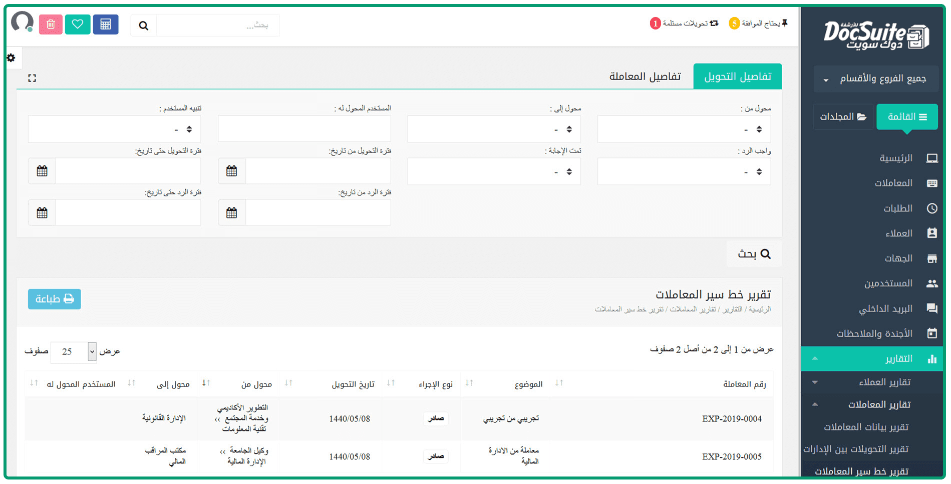 نظام متكامل يشمل جميع أنواع وأشكال المعاملات والمراسلات داخل المؤسسات سواء كانت مراسلات إدارية داخلية أو خارجية (الصادر والوارد)، ويقوم على أربعة محاور رئيسية لتوفير أفضل إدارة للصادر والوارد وهي تسجيل المعاملة وأرشفتها تلقائيًا وتتبع حركة الإحالة للمعاملة والاستعلام والتصدير لها حتى الانتهاء منها واتخاذ قرار بشأنها سواءً بالحفظ أو كصادر عام.